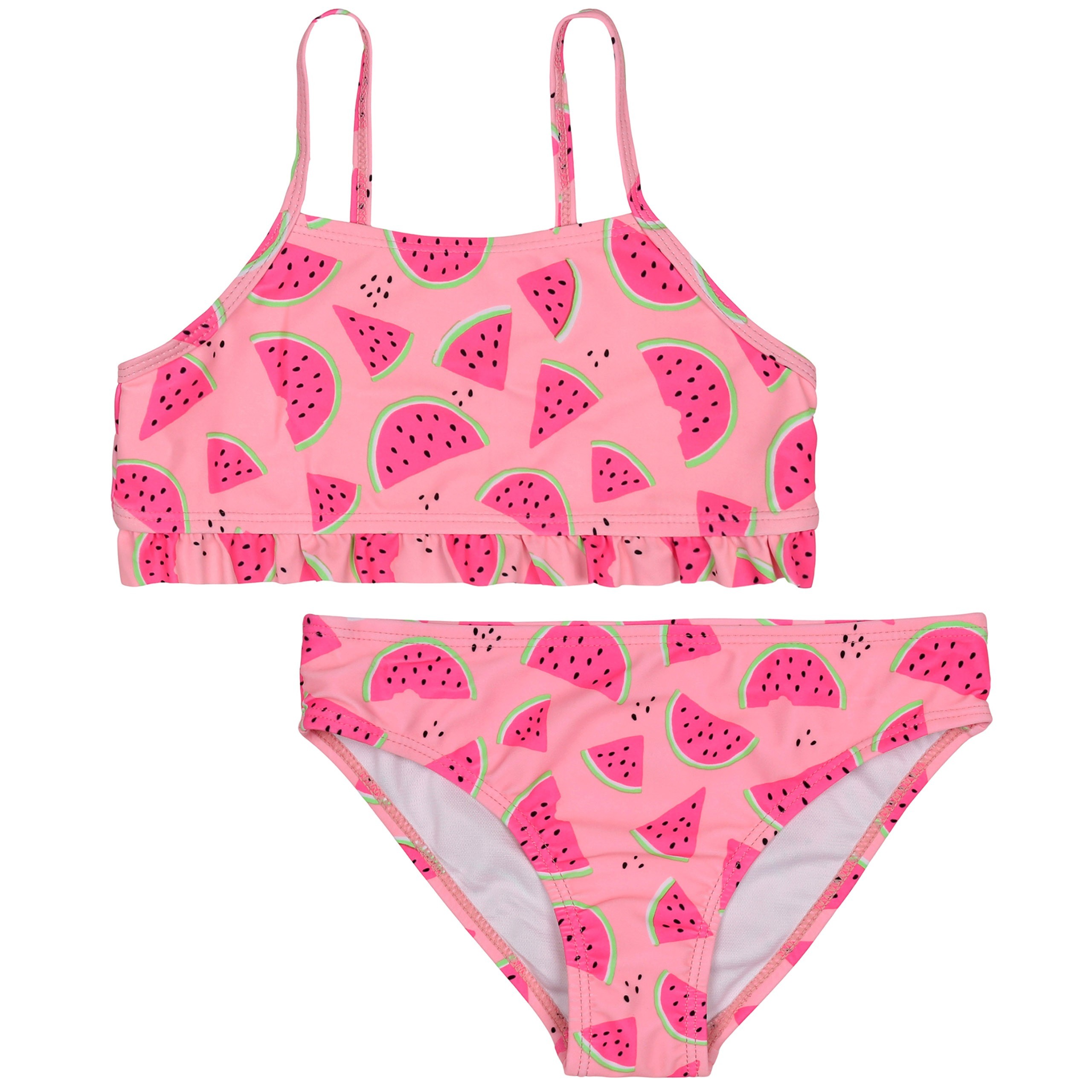 Dziewczęcy dwuczęściowy strój kąpielowy z motywem arbuzów to uroczy i stylowy wybór na letnie dni. Wykonany w różowym kolorze, strój kąpielowy jest ozdobiony uroczym wzorem arbuzów, który dodaje mu świeżości i radości.